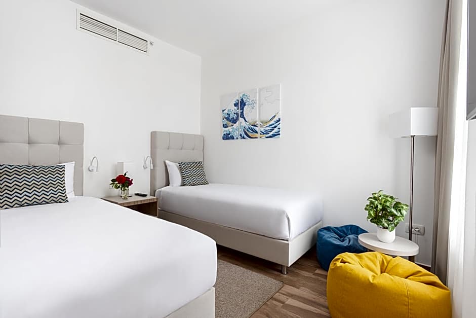 TWO BEDROOM FAMILY SUITE is 452 square feet and includes either 2 single beds 80-130 width or a queen-size bed 150-154 width plus balcony, desk, cable tv, hairdryer, tea and coffee making facilities , ironing set, and safe.